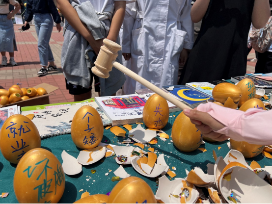 在活動中,同學們熱情高漲,特別是砸金蛋環節,同學們首先在金蛋上寫下壞心情或者煩惱,然后用力打碎,這個過程既解壓又開心,砸碎的金蛋是“破舊”,蛋殼中還有一句暖心的話語是“立新”,同學們還可以拿著蛋里的號牌去兌換禮物,得到禮物上一個主人的美好祝福。此外,套圈活動既有競技帶來的喜悅,又有獲取禮物的快樂。現場物物交換環節也非常有意思,大家交換心情、傳遞美好。