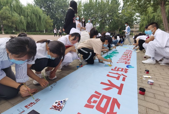 在“愛國主義教育”主題活動中,師生們“一起開班會”,“一起談談心”,“一起拍張照”,“一起畫幅畫”,以“四個一”活動拉開國慶節活動的序幕。學校領導、二級學院和職能部門負責人以及輔導員老師們深入學生宿舍,將班會開到宿舍,與學生談心,了解學生的思想動態。同學們以宿舍為單位,選取學校的各個角落,拍攝宿舍全家福。護理系的師生們在文化廣場共繪長卷,用畫筆描繪紅色記憶,五彩斑斕的長幅畫卷生動展現了盛世中國的繁榮景象。