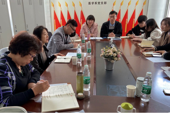 四名新入職的2019級專職輔導員首先匯報了開學以來的工作情況、工作心得。劉爽老師談到:身為輔導員不僅要在思想政治方面培養學生樹立良好的思想道德素養和醫學專業素養,同時輔導員自身也要不斷充實和完善自己,以科學的理論素養作為輔導員工作的理論支撐,以豐富的工作經驗為依托,為從事學生工作打好堅實基礎。在學生思想建設方面,王倬老師以本班新生在入學后產生的心理困惑為例,與大家分享了自己在與心理困惑學生溝通中收獲的一些經驗和感受。在班級管理方面,周莉老師以做好學生的政治思想工作為主線,分享了自己在班級管理中的經驗和體會,從班風學風抓起,探索系統、科學的學生工作規律。王杉杉老師分享了開學以來幾例較為典型心理困惑建檔學生事例,與大家交流了在疏導學生心理困惑方面的經驗和體會。隨后,醫學口腔公衛學工支部2018級、2017級專職輔導員,結合醫學口腔公衛學工支部的學生管理特點,對學生管理和各類專項工作進行了全面的匯報。輔導員老師們就大學生思想政治教育、心理困惑、分類指導、少數民族學生管理、校園安全管理、獎助工作、就業實習等方面進行了工作經驗的交流與分享。