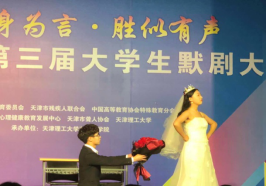 在全國助殘日和全國心理健康宣傳月到來之際,為進一步加強殘疾人職業發展和心理融合,天津市教育委員會、天津市殘疾人聯合會和天津市學生心理健康教育發展中心聯合舉辦第三屆大學生默劇大賽,大賽分初賽和決賽兩個階段完成。初賽以評委分組觀看視頻的方式進行,我校組織翱翔心理社同學精心改編和設計的參賽作品《人生》以第十名的成績順利晉級決賽。決賽在天津理工大學聾人工學院進行,16支參賽隊伍競爭激烈,我校參賽演員通過精致的妝容、精湛的表演、精美的舞美精彩展現出了童年、少年、青年、中年、老年五個人生階段的經歷和心路歷程。豐富的劇情和肢體表演的形式讓同學們既感受到非語言表達的魅力,通過無聲的展演方式抒發內心情感,也讓臺下的觀眾在觀看默劇的過程中舒緩壓力,改善心理認知和情緒狀態,達到舒緩情緒的效果。