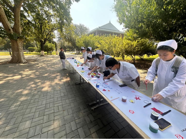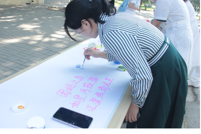 活動現場,潔白的百米畫紙席桌鋪開,護理系的同學們在長卷之上,用色彩斑斕的畫筆,每一筆、每一劃都勾勒出自己對各民族團結的理解和美好愿望。他們以筆為媒,以心傳情,將自己對民族團結的深刻理解與美好愿景傾注于畫布之上。