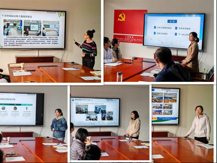 各系以PPT形式匯報展示了本學期開展的“校園文明行為培養(yǎng)”主題活動情況,并對近期學生突發(fā)事件經(jīng)過和處理情況進行匯報。