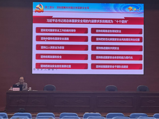陳振鋒書記在報告中從正確認識國家安全及國家安全形勢、深刻理解和把握總體國家安全觀、深入領會構建新安全格局的實踐要求三個方面內容,結合現實案例,深入淺出的講述了國家安全的重要含義、新時代我國國家安全面臨的新外延和新形勢。