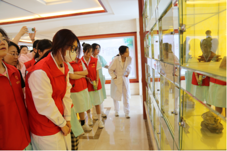 隨后,在周老師的帶領下,同學們來到中醫藥文化長廊參觀學習。進入文化長廊,同學們被濃郁的中醫藥文化氣息所吸引。在老師的講解下,大家一起追隨著中醫藥發展的歷史脈絡,感悟中醫藥文化的博大精深。一座座古代名中醫雕像,一段段中醫古籍文字,一個個飽含歲月的中藥器皿,一株株珍貴的中草藥,讓同學們駐足觀望、流連忘返,仿佛與古代的醫者展開了一場時空對話,進一步領悟了大醫精誠的醫德精神。