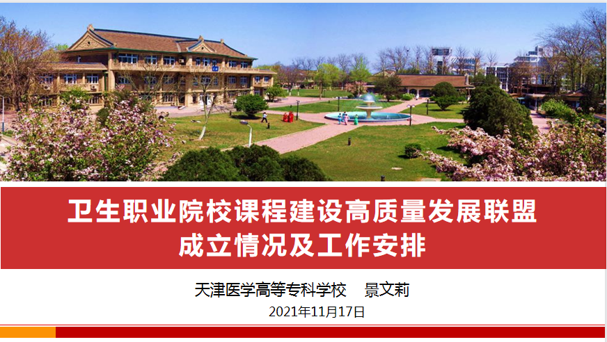 2021年11月17日,全國衛生職業教育教學指導委員會與天津醫學高等專科學校共同主辦的“推進衛生職業教育高質量發展研討會”線上順利召開,衛生職業院校課程建設高質量發展聯盟在會上宣布成立并揭牌。