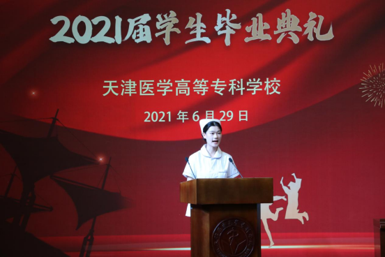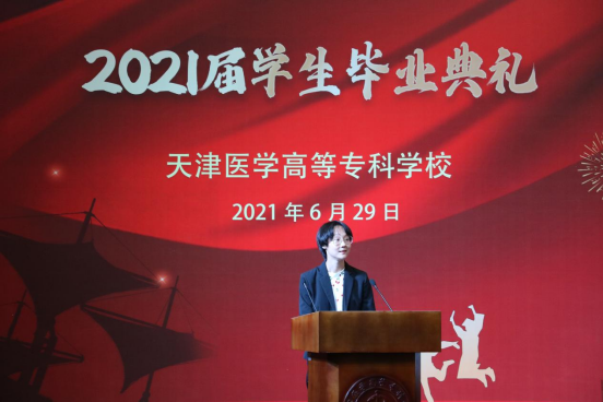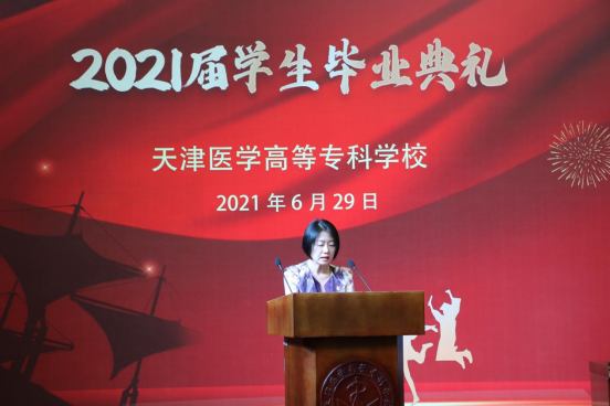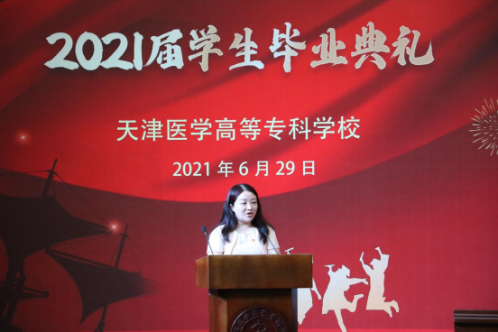 教師代表儲媛媛老師也為畢業生送上臨行前的祝福與期望,2021屆的畢業生經歷了新冠肺炎的嚴峻考驗,也迎來了建黨百年的光輝時刻,作為將親歷“兩個一百年”交匯的新時代醫專學子,作為奮斗在臨床一線的醫務工作者,希望同學們繼續秉承“嚴謹、求實、創新、奉獻”的校訓,在工作崗位上踐行“敬佑生命、救死扶傷、甘于奉獻、大愛無疆”的醫療衛生精神。