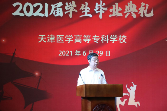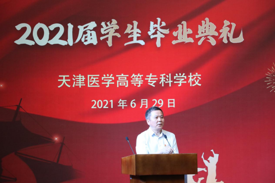 張彥文校長對畢業生深情寄語,向圓滿完成學業的2021屆醫專學子們致以熱烈的祝賀,向辛勤耕耘、默默付出為學生成長成才作出貢獻和服務的實踐基地的校內外老師及工作人員和家長致以崇高的敬意和衷心感謝。張校長帶領同學們一同回憶三年來國家和個人發展的關鍵時刻,同時,向畢業生們提出三點希望:第一,希望同學們心懷夢想,做一個有家國情懷的人;當今世界正處于百年未有之大局,機遇挑戰并存,同學們要不忘初心,與時代同心同向同行,將個人成長與國家發展、民族復興結合起來;把個人夢想與同國家民族的夢想熔鑄起來,在實現醫藥強國夢,推動人類衛生事業發展的偉大征程中書寫時代青春華章;第二,希望同學們愛黨敬業,做一個有擔當作為的人;要愛崗敬業,做好工作,不斷學習,掌握工作標準要求;要學以成人,涵養道德情操;要有擔當有作為,盡你所學造福家鄉、造福群眾;第三,希望同學們恪守醫德,做一個誠實守信的人;時刻牢記“健康所系,性命相托”的醫學生誓言,希望大家在掌握精湛醫技之時,砥礪崇高的醫德,踐行學校理念。
