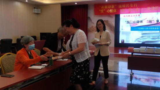 濱海高新區華苑社區工作人員進行了積極的宣傳、組織工作,活動當天,有數十名老年人參加了此次活動。天津醫專圖書館杜美婷館長介紹了此次活動的意義和目的,之后由社區負責人和杜館長一同給老人們頒發了圖書,鼓勵老人們多讀一些保健書籍,促進身心健康。