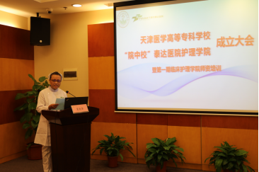 泰達醫院院長張立群在致辭中表示,十余年來天津醫專為醫院護理隊伍輸送了大批優秀的畢業生,現多名已成為護士長和教學老師。今年學校又為醫院投資建設了臨床情境模擬專科護理實訓中心和基礎護理、重癥護理實訓中心。對天津醫專多年來給予我院臨床護理教學工作的大力支持表示衷心的感謝。今天天津醫學高等專科學校“院中校” 泰達醫院護理學院正式成立,將會成為我院護理教學工作的另一個新起點。