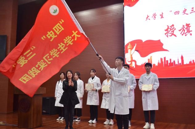 第四項(xiàng)議程由校黨委副書記、副校長(zhǎng)左紅為“四史三愛”學(xué)習(xí)實(shí)踐團(tuán)授旗。
