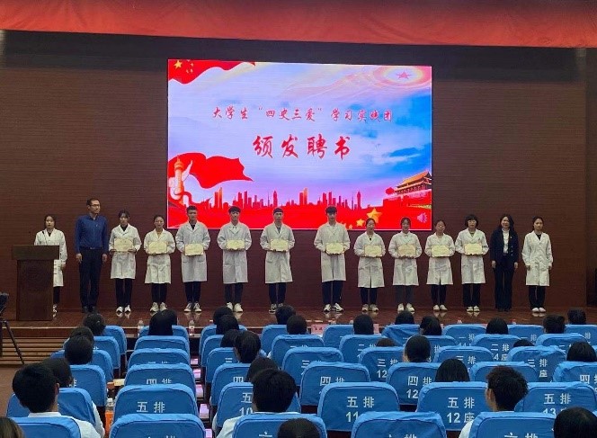 第三項(xiàng)議程由醫(yī)療技術(shù)黨支部書記商其杰、系主任張秀麗為“四史三愛”學(xué)習(xí)實(shí)踐團(tuán)成員頒發(fā)聘書。