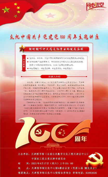 在建黨百年華誕來臨之際,2021年4月17日,由天津圖書館、中國農工民主黨天津市委員會主辦的“同心講堂”,邀請天津市中醫藥研究院副院長、我校醫學系名老中醫大師工作室領銜專家——張智龍教授,以“慶祝中國共產黨建黨100周年—新時期下中醫藥文化事業的發展歷程”為主題進行匯報講座。