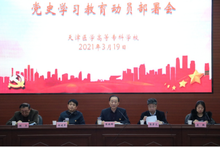 3月19日下午,天津醫學高等專科學校召開黨史學習教育動員部署大會,深入學習貫徹習近平總書記重要講話精神,緊密結合學校發展實際,對學校開展黨史學習教育進行動員部署。校黨委書記陳振鋒動員講話,校長、黨委副書記張彥文做工作部署,黨委副書記、副校長左紅主持,領導班子成員出席會議,全體教職工參會。