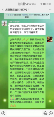 醫學系中醫教研室兩位年輕的針灸推拿專業骨干教師發揮我校針灸推拿走向國際化的優勢,立即開始組建相應的教學資源,在職教云平臺上建課,為充分了解學員的情況因材施教,及時編寫出《威縣基層中醫適宜技術培訓課前學員問卷》;還撰寫了《威縣基層中醫適宜技術培訓課程介紹》、《威縣基層中醫適宜技術培訓線上學習指導》方便學員培訓前熟悉線上學習內容和掌握線上學習方法;還在100名學員微信培訓群的基礎上,按班建制分為兩個班級群,便于更好地進行學員管理和授課答疑。