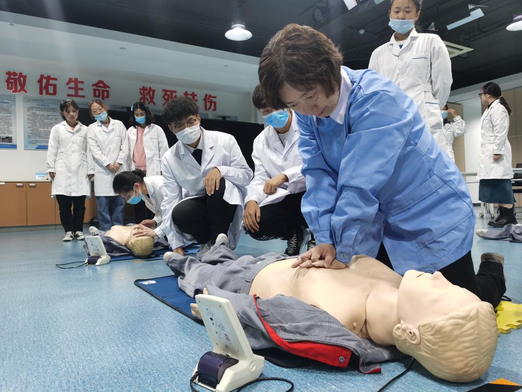 在職業精神培養項目中,邀請天津市抗擊疫情英雄校友天津市泰達醫院急診科郭珺副護士長為學生進行抗疫精神的專題講座并作為天津市急救技術競賽一等獎獲得者為在場學生進行了心肺復蘇技能展示。