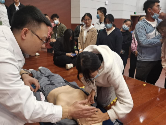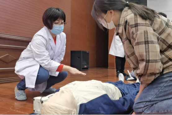 我校HQCC公眾心肺復蘇培訓基地導師劉英擔任培訓講師。分別從評估呼救、胸外按壓、人工呼吸、人文關懷等流程進行了情景式教學。之后,培訓導師徐蓉、許英、張碩三位老師分別為學生進行現場技能操作指導。