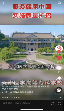 我校高職擴(kuò)招典型經(jīng)驗(yàn)做法“服務(wù)健康天津建設(shè),實(shí)施質(zhì)量型擴(kuò)招”,經(jīng)天津市教委推薦,通過(guò)教育部職成司組織的專家遴選,入圍全國(guó)高職擴(kuò)招47個(gè)典型經(jīng)驗(yàn)案例,在“中國(guó)高職高專教育網(wǎng)”上以專欄形式刊登。同時(shí),教育部從中優(yōu)選10所院校進(jìn)行視頻宣傳,我校成功入選,在教育部職成司“職教小微”抖音公眾號(hào)上發(fā)布推廣,供各兄弟院校學(xué)習(xí)交流。