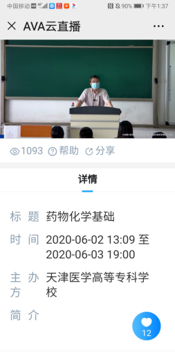 6月3日,天津醫學高等專科學校張彥文校長在給2019級藥學專業110位學生講授《藥物化學基礎》課程時,借助在線課程錄播平臺同時向因防疫需求未能返校的21位同學開展教學。