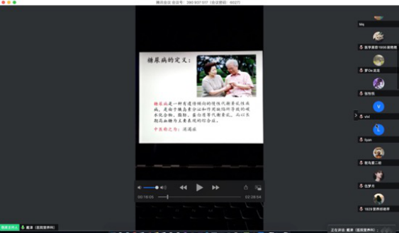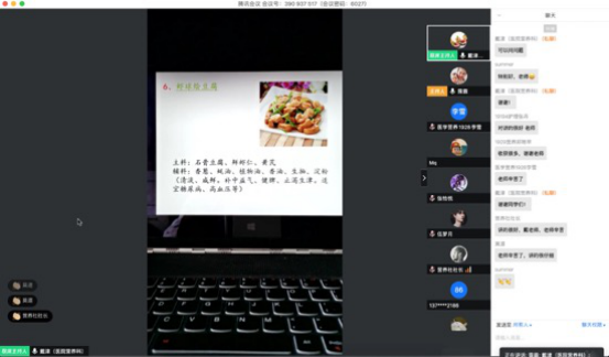 為了響應全民營養周活動,公衛系創新辦會形式,將線下培訓搬到線上舉辦。邀請中國人民解放軍聯勤保障部隊天津康復療養中心主管營養師戴津老師面向我校營養社學生,以藥膳食療為主題,就糖尿病患者日常中醫養生與飲食治療為內容開展培訓。同學們踴躍報名,涉及醫學營養、護理、醫學美容、臨床醫學等專業共37人參加了培訓。為了做好培訓,讓同學們既有理論學習又能有技能收獲,公衛系將培訓中的實踐操作內容以視頻的形式在講解中穿插播放,豐富了培訓的內容,活躍了培訓的氛圍。培訓后又將課程內容上傳職教云,組成云班級,方便同學們復習,重放操作。讓同學們做到課有所學,學有所練。