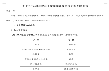 1.組織學校層面線上教學抽查。為進一步規范線上教學管理與質量監控,學校組織了期初線上教學檢查,在各系部自查基礎上,本周教務處聯合督導室進行了學校層面線上教學抽查,由督導專家、教研室主任、教學秘書組成教學檢查工作組,對各系部線上教學實施、線上實習組織、教學文件編制、教研活動組織、課程期末考試分析及線上聽課落實等情況開展了抽查,針對存在問題,及時反饋,及時整改。