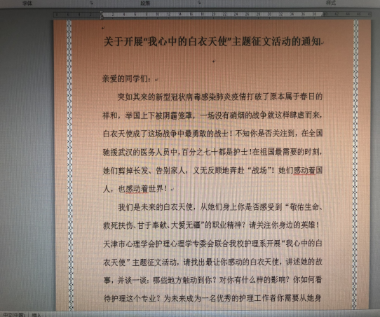 為培養護生“敬佑生命、救死扶傷、甘于奉獻、大愛無疆”的職業精神,專委會聯合學校護理系于2020年2月17日—3月26日開展“我心中的白衣天使”主題征文活動,緊緊圍繞當前抗擊疫情的實錄、見聞、事跡等,生動講述醫護人員的故事,謳歌和贊頌英勇戰斗在防疫一線的護理工者。此次活動得到了護理系領導及各班輔導員的大力支持,經過推薦選拔,截至3月26日共收集2018、2019級學生226篇征文,目前正在由專委會15位臨床一線的老師進行批閱,將分別評選出一等獎10篇;二等獎20篇;三等獎30篇;優秀獎50篇,其余為鼓勵獎,優秀作品計劃在5.12護士節期間組織優秀作品分享會,屆時將邀請在本次抗擊疫情中戰斗在一線的優秀護士與獲獎同學共同分享經歷體會。