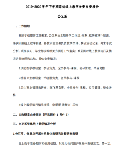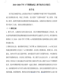 1.組織各系部開展線上教學(xué)自查。為進(jìn)一步規(guī)范線上教學(xué)管理,加強(qiáng)線上教學(xué)質(zhì)量監(jiān)控,學(xué)校組織期初線上教學(xué)檢查,本周開展系部自查,下周進(jìn)行學(xué)校層面教學(xué)檢查。教務(wù)處下發(fā)《2019-2020學(xué)年下學(xué)期期初線上教學(xué)檢查通知》,各系部積極落實(shí),制定自查方案,針對(duì)線上教學(xué)運(yùn)行、教學(xué)文件編制、教研活動(dòng)開展、線上實(shí)習(xí)教學(xué)組織及線上聽課落實(shí)等進(jìn)行自查,形成系部自查報(bào)告,研判問題,及時(shí)診改。