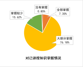 學生學習情況良好,每日線上學習時間基本保持在3-6小時,91.35%的學生表示可以跟上教師授課進度,能夠大部分或全部掌握已講授的知識的同學占比83.85%,73.77%的學生對線上自主學習效果評價為滿意或非常滿意。
