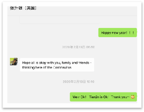 英國威斯敏斯特金斯威學院國際部主任張勝銀女士通過微信寫到,希望我們一切安好,包括家人、朋友,她在英國也時時關注著疫情的發展。