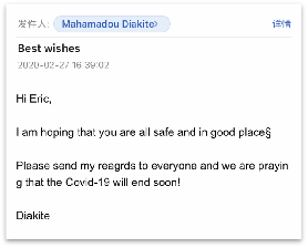 去年底順利揭牌的馬里魯班工坊承建校巴馬科科技大學副校長迪亞凱特教授代表學校通過郵件送來祝福,希望大家都是安全的,希望這次疫情早日結束!