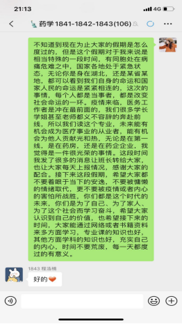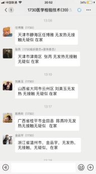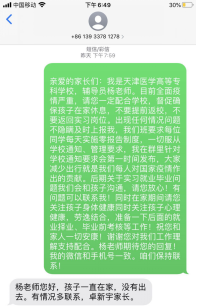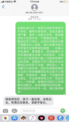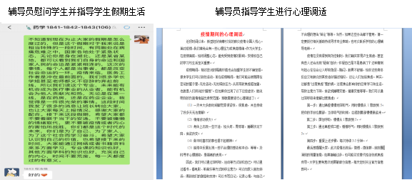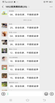 系領導建立留津留校學生聯系群,引導學生認真落實學校防疫工作要求,指導學生做好假期留校學習生活,為同學們排憂解難。系學工辦楊樂老師、羅丹老師,分別承擔三個年級在防疫期間的實習生管理、健康排查工作等工作。特別是針對877名實習生,分布在天津、北京、上海、山東、武漢等地區實習,由于實習生春節假期回家,105人曾經停湖北地區,根據防疫工作要求指導學生居家觀察、進行健康監測成為畢業班輔導員心頭最大的壓力。為指導學生積極配合社區工作,科學防疫、緩解心理焦慮,楊樂老師對所負責班級學生家長進行聯絡,與家長和學生說明暫緩實習的要求并了解居家觀察情況。