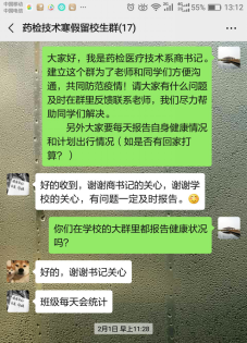 為深入貫徹落實習近平總書記關于防控新型冠狀病毒感染的肺炎疫情的重要指示精神,根據學校疫情防控工作領導小組的要求,扎實做好學生工作,保障學生的平安和健康,藥檢醫療技術學工支部不忘守護學生的初心,牢記服務學生的使命,堅定信心、眾志成城,著力把防控疫情工作落地落實落細,堅決打贏這場疫情防控阻擊戰,做好學生的暖心人。
