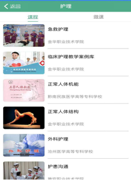 打開APP,實(shí)名注冊并登錄(圖5,PC端和手機(jī)端共用一個(gè)賬號(hào)),點(diǎn)擊屏幕下方的“資源庫”切換界面,在專業(yè)中選擇”護(hù)理“,即可進(jìn)入到課程和微課頁面,選擇相應(yīng)課程和微課即可學(xué)習(xí)(圖6)。