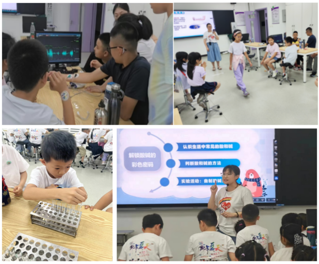 在趙婷老師的課程中,同學們認識生活中常見的酸和堿、學習PH試紙的使用以及自制酸堿指示劑,并通過實驗操作了解食品中酸堿平衡對日常生活的影響;稱“手”量“腳”課堂上,王倩老師現場調研學員們平時的鍛煉次數、頻率及方法,通過人體機能實驗系統測定小朋友的握力和步速,讓學員們認識到保持人體的肌肉力量和質量及肌肉功能的重要性。