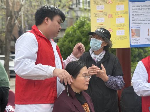 針推專業的學生們為現場的居民熱情提供專業的推拿服務,用輕柔有力的手法進行按摩,一邊進行身體的放松,一邊耐心解答疑問,吸引了一眾居民排隊參與推拿體驗。一位老人感嘆道:“這群孩子手法太專業了,以后還會再來嗎?”