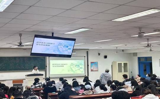 隨后,田鑫宇、姬文嘉、李萬鵬、王鄭雪、王康五位優(yōu)秀的大三學(xué)生代表依次上臺(tái),分享了他們?cè)趯I(yè)學(xué)習(xí)、實(shí)習(xí)實(shí)踐經(jīng)歷和職業(yè)規(guī)劃方面的經(jīng)驗(yàn)和心得,并結(jié)合自己在醫(yī)院營養(yǎng)科實(shí)習(xí)的經(jīng)歷,介紹如何將理論知識(shí)應(yīng)用到實(shí)際工作中,以及如何與患者和醫(yī)護(hù)人員進(jìn)行有效的溝通。
