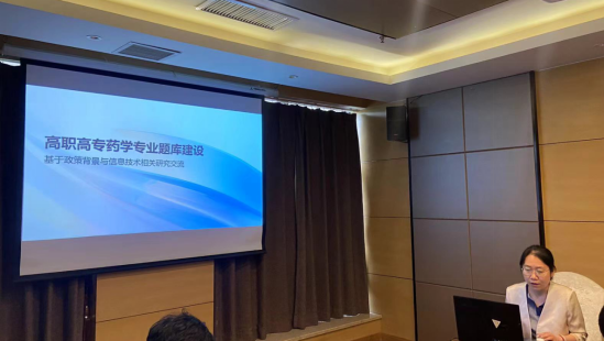 天津醫學高等??茖W校劉芳教授作《高職高專藥學專業題庫建設》匯報,主要從政策背景與教育評價改革要求、藥學題庫建設方案概覽兩方面展開。