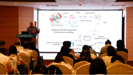 在主會場,天津醫學高等??茖W校邀請俄羅斯科學院院士葉夫根尼·尼古拉耶維奇·尼古拉耶夫蒞臨現場做大會報告。重點介紹了質譜技術的前沿理論和在醫學領域的最新研究進展,如高精度血漿蛋白定量方法、面向腎臟疾病等的尿液蛋白質組分析,以及可同時檢測數百種蛋白質的試劑盒研發進展等。