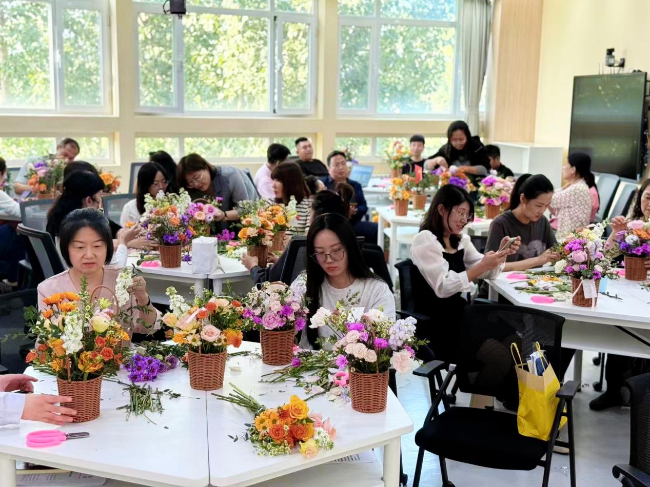 活動當天,流程緊湊,富有溫度。下午3點,活動正式拉開帷幕。黨委學工部負責人首先致辭,肯定了開學以來輔導員在學生管理、思想引領、應急處置等工作中的辛勤付出,也強調了關注自身心理健康的重要性,希望通過此次插花活動,讓輔導員暫時卸下工作重擔,在與鮮花的互動中感受美好、舒緩壓力。隨后,專業插花講師從插花基礎知識入手,詳細講解了花材養護、色彩搭配、構圖技巧等內容,同時結合雙節寓意,分享了“團圓”“祝福”等主題插花的創作思路,并現場進行示范操作,生動的講解與嫻熟的技巧讓在場輔導員快速掌握了插花要點。