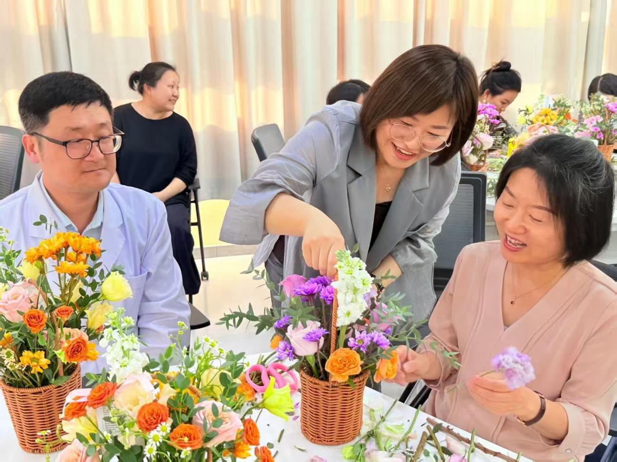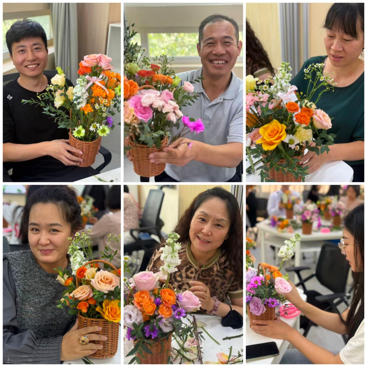 在自主創作環節,輔導員老師們迅速投入狀態。有的認真挑選花材,結合自身審美搭配色彩;有的與身邊同事交流想法,在協作中完善作品;有的專注修剪枝葉,在細致的操作中平復思緒。心理中心工作人員全程巡回陪伴,時而協助整理花材,時而與輔導員輕聊工作與生活,營造出輕松愉悅的氛圍。期間,不少輔導員表示,“平時滿腦子都是學生的事情,現在專注于插花,感覺整個人都靜下來了”,“看著手中的花慢慢變成完整的作品,特別有成就感”。