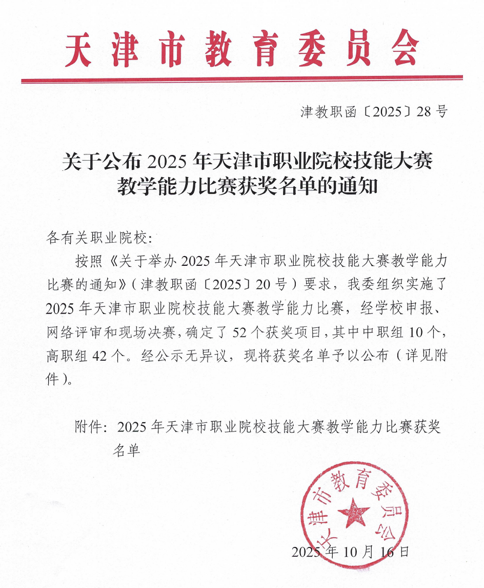 近日,2025年天津市職業(yè)院校技能大賽教學(xué)能力比賽圓滿落下帷幕,各院校共報(bào)送參賽作品93件,經(jīng)網(wǎng)絡(luò)初評(píng)公示無異議遴選出55件作品入圍現(xiàn)場(chǎng)決賽。我校經(jīng)過校賽選拔、網(wǎng)絡(luò)評(píng)審、現(xiàn)場(chǎng)決賽幾輪比拼,共有4個(gè)教學(xué)團(tuán)隊(duì)斬獲市級(jí)獎(jiǎng)項(xiàng),其中一等獎(jiǎng)2項(xiàng)、二等獎(jiǎng)1項(xiàng)、三等獎(jiǎng)1項(xiàng),通過此次比賽,教師團(tuán)隊(duì)在師德踐行、專業(yè)教學(xué)、數(shù)字素養(yǎng)、綜合育人等多方面能力得到顯著提升,充分展現(xiàn)示范引領(lǐng)作用,續(xù)寫我校在該項(xiàng)賽事中的輝煌成績(jī)。