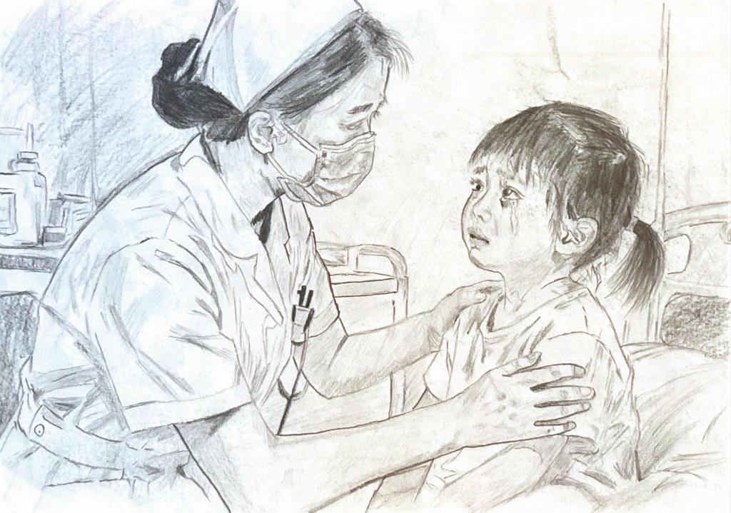 設計理念:這幅畫以寫實素描質感,以病房為背景,聚焦護士安撫患病孩童的瞬間,借孩童哭泣神態與護士撫肩握臂的輕柔互動,傳遞醫療場景的人文關懷,消解病痛冰冷。以俯身溫柔神態,展現“專業+溫柔”特質。作品以“醫患善意聯結”為核心,體現醫療人文關懷,實現職業致敬與情感共鳴。