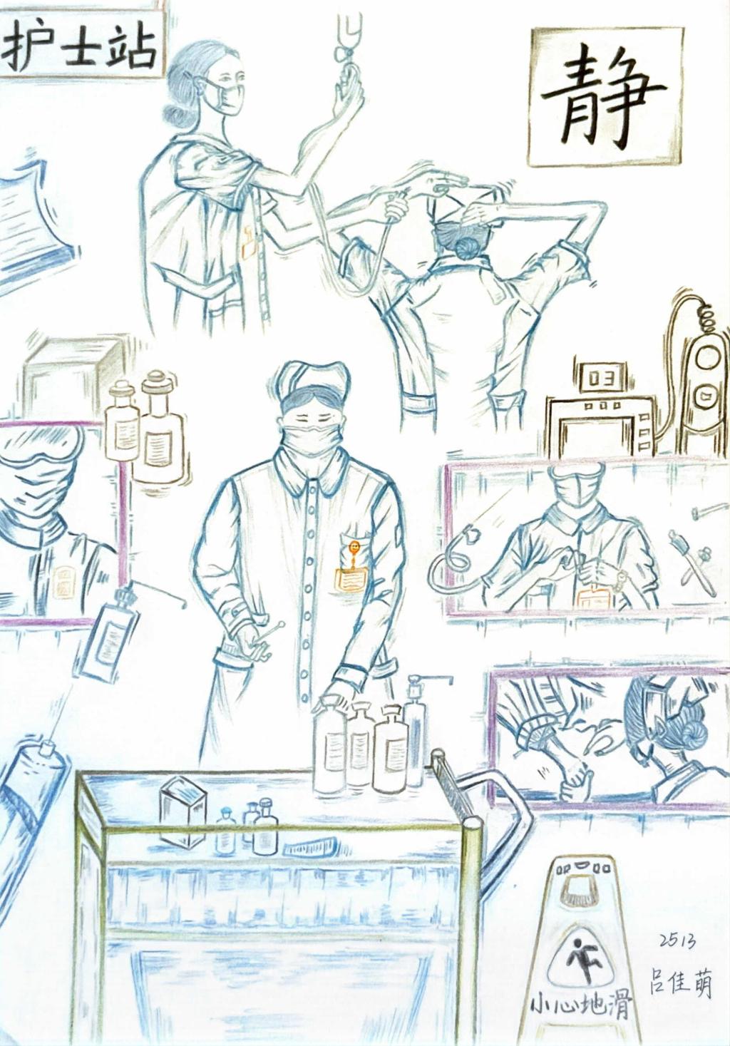 設計理念:這幅作品運用紅十字、橄欖枝等元素,刻畫出醫護人員細心照顧病人的場景,傳遞溫暖與希望,讓大家感受到醫護人員的專業和關懷,同時也讓人們更珍惜生命與健康。