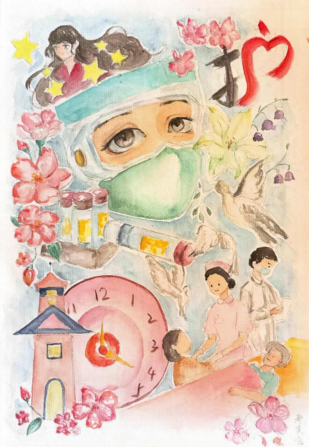 設計理念: 這幅畫以水彩繪就,借醫護人員的堅毅眼神、白鴿與繁花,歌頌日夜堅守的奉獻。時鐘與塔樓象征時間與希望,紅“護”字與醫患互動,傳遞守護生命、溫暖人心的信念。