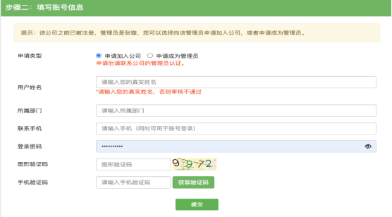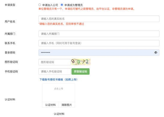 (2)當公司管理員出現(xiàn)更換/離職等情況,您可以申請成為管理員,提交相關證明材料后由平臺認證(1~3個工作日內審核完成),認證通過后您可以加入公司并成為公司管理員。