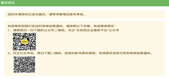 填寫完成后點擊提交,等待管理員/平臺審核通過后即可。若您需要接收審核通知,可根據頁面提示關注“云校招企業(yè)服務平臺”公眾號接收消息。