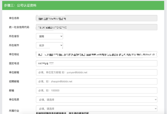 情況二:您的公司未曾注冊過快招聘|云校招企業(yè)服務平臺,則需要填寫公司招聘相關的資料并由平臺進行審核。平臺將在1~3個工作日內審核完成,您可通過賬號設置綁定“云校招企業(yè)服務平臺”接收審核通知。
